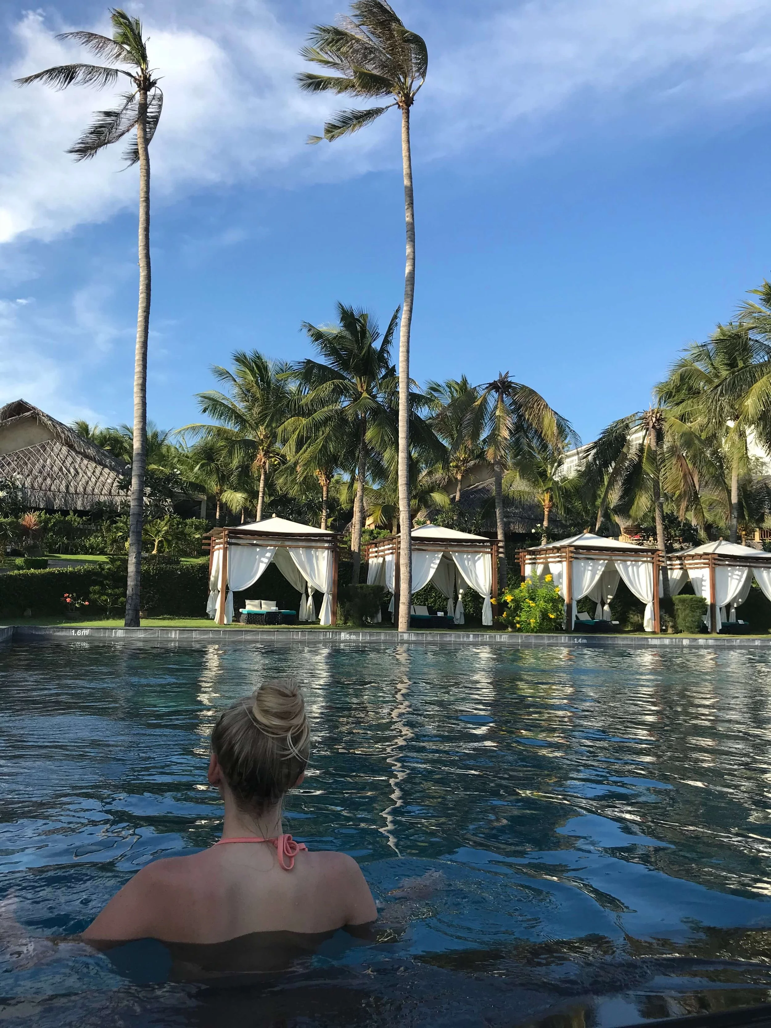 Vietnamin aurinko on polttava. Aroma Beach Hotel altaalla, Mui Ne, Phan Tiet, Vietnam